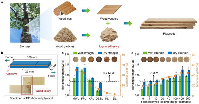 该团队在前期研究基础上,受木质素以类似“胶”的形式绑定林木生物质中纤维素和半纤维素的启示,从生物质(例如木材和秸秆)中提取出高活性木质素,制备成新型绿色木质素胶黏剂;使用该木质素胶黏剂,可以在较宽热压温度范围(100–190 °C)内制备出性能优异的胶合板,拥有绿色、工艺简单、性能优异、成本低的优势,具有替代传统石化基木材胶黏剂的巨大潜力。