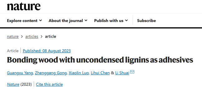北京时间2023年8月8日,国际期刊《自然》(Nature)以快速发表的形式报道了我校材料工程学院帅李教授团队题为“Bonding wood with uncondensed lignins as adhesives”(“未缩合木质素作为木材胶黏剂”)的最新研究成果。开云网页版为唯一完成单位。这是我校生物质基功能材料研究中心在生物质资源高值化利用领域研究出的一项重大成果。