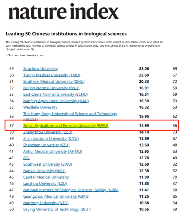 近日,自然出版集团(Nature)最新发布的2023年中国自然指数榜单(Nature Index 2023 Annual Tables),我校生物科学排名全国第37位,在国内农林高校中位列第5,位于中国农业大学、华中农业大学、西北农林科技大学、南京农业大学之后,在省内高校仅次于厦门大学。