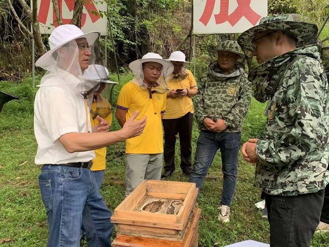在广西都安神瑶公司蜂场现场,苏松坤为企业养蜂技术员讲解了组织中蜂双王群优质高产的优点及技术要点,结合蜂群的实际情况对中蜂单王群饲养优质高产提出了相关建议,并重点就“巢箱+浅继箱”的饲养方式受限于蜜源条件以及群势的问题,提出了“巢箱+框式隔王板”生产优质分离蜜的解决方案。
