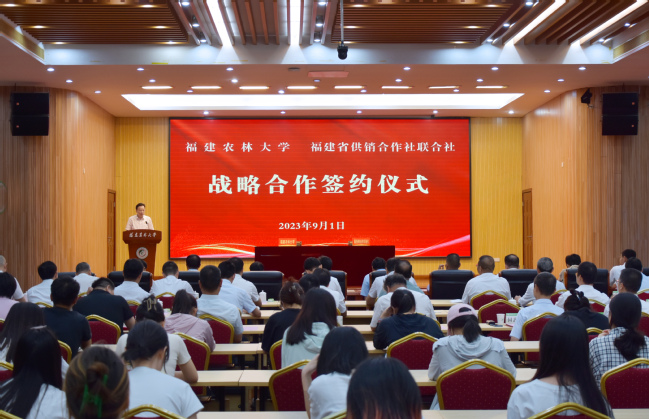 9月1日下午,我校与福建省供销合作社联合社战略合作签约仪式在常盛会议中心举行。福建省供销合作社联合社副主任占飞豹、邱志向、林勤,党组纪检组组长郭强,我校党委书记王建南,校长兰思仁,校党委副书记陈世奎、曾华平,副校长郑宝东、唐振鹏、周顺桂出席签约仪式。签约仪式由郑宝东主持。