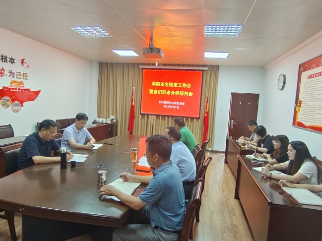 9月7日上午,公共管理与法学院党委召开安全稳定工作会,会议由学院党委书记曾起郁主持,学院党政班子成员、科级干部、全体辅导员参加会议。