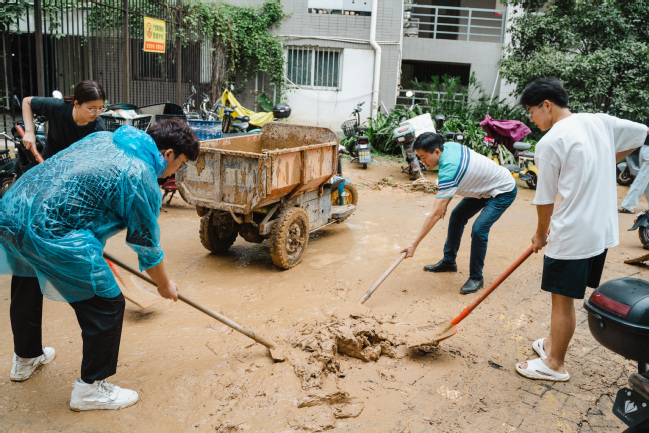 清淤现场,志愿者们分片包干、分工协作,运用扫帚、铁锹、高压水枪等工具,认真清扫垃圾、清除淤泥,干得热火朝天。面对水退后遗留的垃圾,大家不怕脏不怕累,任凭泥巴裹满裤腿,汗水湿透衣背,全力以赴投入到清理工作中。经过4个小时的连续奋战,现场遗留的垃圾已清理干净,路面积水基本消退,道路也恢复到暴雨前整洁的模样。