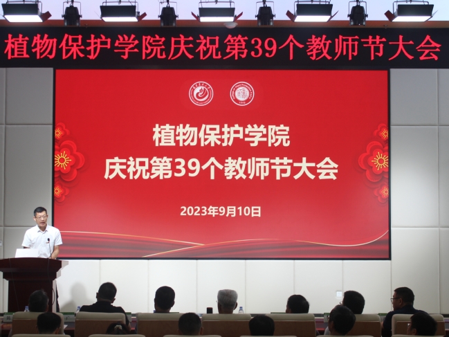 9月10日上午,植物保护学院在国重大楼学术报告厅隆重举行庆祝第39个教师节大会,深入学习贯彻习近平新时代中国特色社会主义思想和党的二十大精神,表彰今年以来在党建思政、教学科研等领域作出积极贡献、取得显著成绩的优秀教师,并举行退休教师荣休和新教师入职宣誓仪式。中国科学院院士谢联辉、学院领导、在校教师、学生代表120余人出席大会。