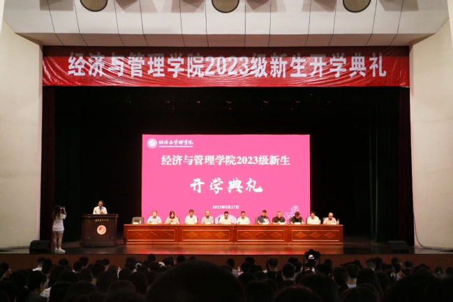 9月17日下午,经济与管理学院2023级新生开学典礼在校大礼堂举行。学院党政领导出席典礼,各系主任、新生班主任、辅导员和全体2023级新生参加典礼。典礼由学院党委副书记李健英主持。