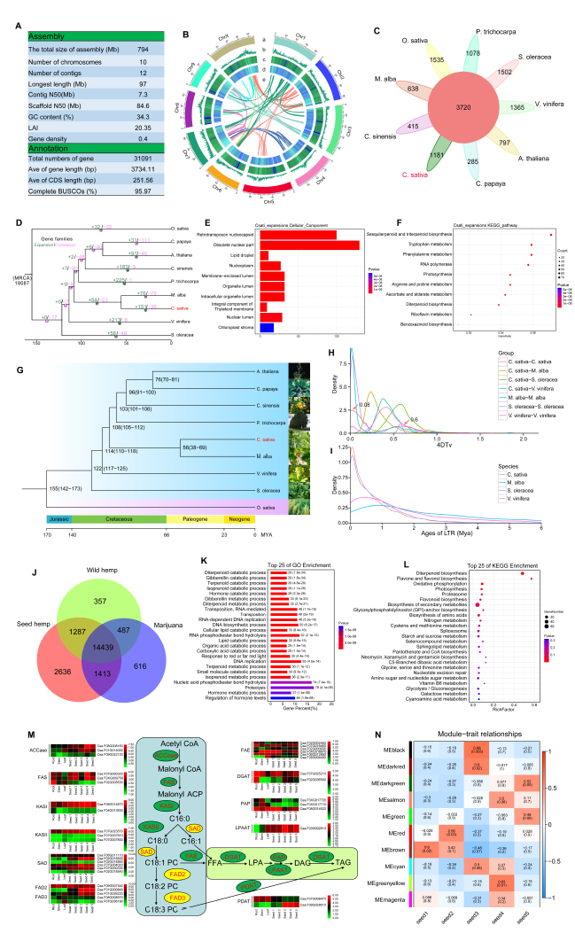 图1. 籽用大麻基因组特征、比较基因组学分析以及脂肪酸合成关键基因发掘