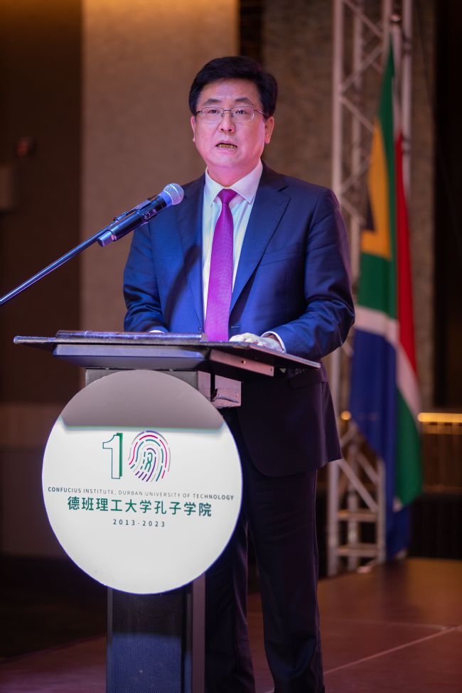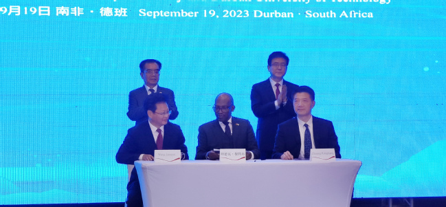 随后,赵龙省长出席了孔院建院十周年庆祝活动,观看了孔院10周年成果展以及学校大学生艺术团与孔院师生共同参演的文艺汇演,见证了学校与德班理工大学续签共建孔院协议以及学校与厦门金砖办和德班理工大学三方战略合作协议签署仪式。赵龙省长与学校党委书记王建南、德班理工大学校长姆腾布、中国驻南非德班总领事李志工共同为“德班理工大学孔子学院中文+职业技能实践中心”“中南智慧菌草平台项目”揭牌,并为全球首本中文-祖鲁语学习词典揭幕。赵龙省长还出席了学校孔院“南非中国茶文化展示中心”揭牌仪式,参观了孔院师生的茶艺表演。
