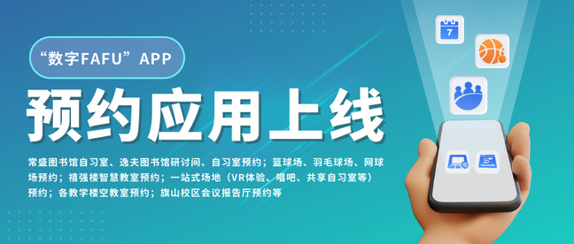 为满足师生办事数字化、便捷化的强烈诉求,近期“数字FAFU”移动APP上线了五项新应用服务:图书馆预约、活动场馆预约、一站式场地预约、会议室预约、智慧教室预约。师生可根据所需的场所在“数字FAFU”移动APP进行线上预约,实现指尖所向,满足所需。