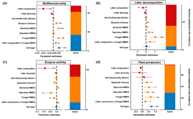 植物属性和微生物多样性是凋落物分解的主要驱动因子,然而关于植物多样性和土壤生物多样性(尤其是真菌分解者)对凋落物际(littersphere)生态系统多功能性(EMF)的相对贡献和独特 贡献的实验证据非常有限。基于此,该研究团队利用微生物“稀释-灭绝法”和盆栽实验,定量了2种不同来源的土壤生态系统的凋落物多样性(1-5种植物)和微生物多样性(10-0-10-10)对凋落物分解,土壤有机碳分解,土壤养分循环,土壤酶活性,植物生产力等功能的影响。结果显示:(1)凋落物多样性和微生物多样性对生态系统多功能性具有独特和交互效应,具体表现为:凋落物物种组成和叶片初始质量与分解更相关,土壤微生物多样性与植被生产力关系更密切,而凋落物多样性和微生物多样性的交互作用对多功能性作用更大(2)真菌群落中的腐生真菌(soil/wood/litter saprobes)在EMF,植物生产力,土壤酶活性和分解功能上发挥的作用比其他真菌类群或细菌更强。