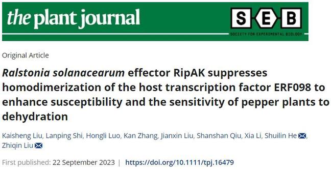 近日,The Plant Journal《植物杂志》在线发表了开云网页版农学院应用遗传学高校重点实验室何水林/刘志钦老师团队题为“Ralstonia solanacearum effector RipAK suppresses homodimerization of the host transcription factor ERF098 to enhance susceptibility and the sensitivity of pepper plants to dehydration”(青枯菌效应蛋白RipAK通过抑制寄主转录因子ERF098的二聚化以增强寄主感病性以及脱水敏感性)的研究论文。