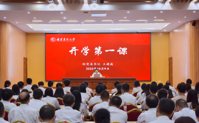 10月9日上午,校党委书记王建南以“立足当下把握未来——对大学学习和未来农业的几点认识”为题,通过线上线下相结合的方式,为2023级新生讲授“开学第一课”。主会场设在金山校区常盛学术会议中心,旗山校区和安溪校区设分会场。校党委副书记曾华平、各学院党委书记和院长、2023级新生代表600多人参加。
