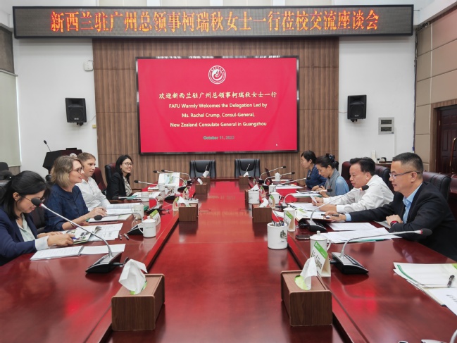 10月11日下午,新西兰驻广州总领事柯瑞秋女士(Ms. Rachel Crump)一行4人莅校洽谈合作事宜。副校长郑宝东在明德楼武夷厅会见了代表团一行并主持座谈。对外处、南太平洋岛国研究中心等相关单位负责人参加会谈。