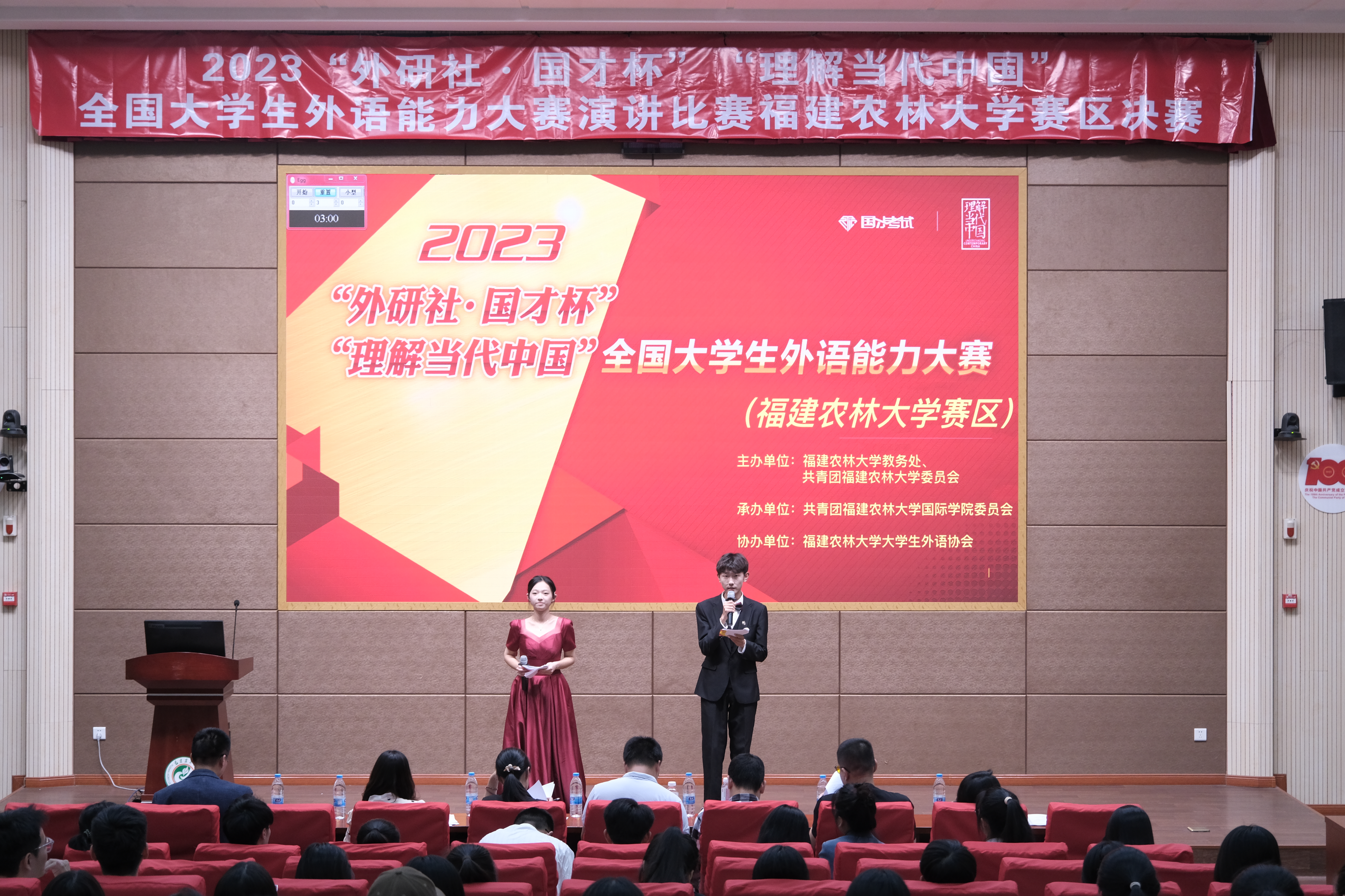 本次赛事于旗山校区小报告厅内举行,在主题“The Chinese Path to Modernization”的启发下,同学们深入理解、生动诠释中国式现代化的内涵,以自信流利的姿态回应评委提问。在充分展现自身英语口语、文学素养和逻辑思维能力时,讲好中国故事,传播中国声音,为观众们呈现出一场精彩绝伦的高水平演讲盛宴。经激烈角逐,评委老师结合参赛选手的演讲内容、语音语调、临场表现等多方面,对各选手进行综合评分,最终来自戴尔豪西大学联合学院(国际学院)翻译硕士贺加贝、动物科学学院(蜂学学院)动物科学专业包磊、风景园林与艺术学院风景园林专业夏雨凝与公共管理与法学院法学专业杨舒晨四位选手脱颖而出,将代表学校参加福建省赛区演讲决赛。