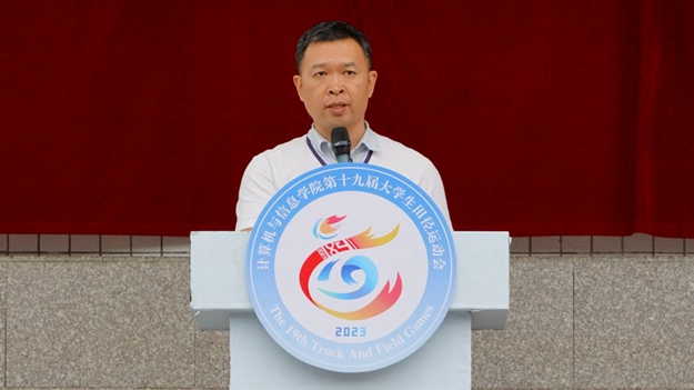 钟一文宣布运动会开幕。伴随着国旗护卫队队员的铿锵步伐,全场师生的嘹亮歌声,五星红旗的猎猎飘扬,计算机与信息学院第十九届大学生田径运动会正式拉开序幕。
