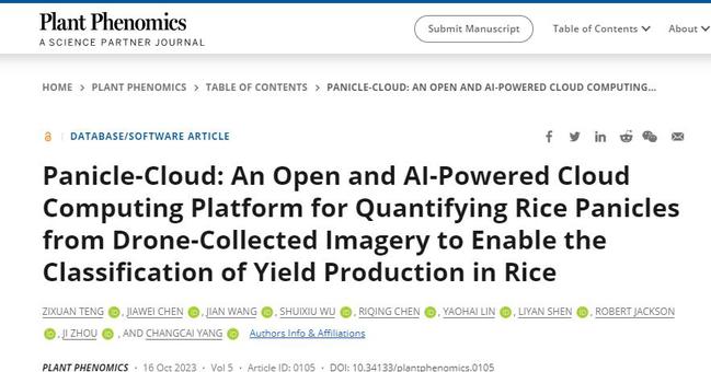近日,我校计算机与信息学院、智慧农林福建省高校重点实验室、农林大数据研究中心在SCIENCE合作创办的农艺学领域权威期刊Plant Phenomics(植物表现组学)上发表题为“Panicle-Cloud: an open and AI-powered cloud computing platform for quantifying rice panicles from drone-collected imagery to enable the classification of yield production in rice(稻穗云:用于从无人机采集的图像中量化稻穗的开放的人工智能云计算平台,以实现水稻产量分类)”的研究论文。
