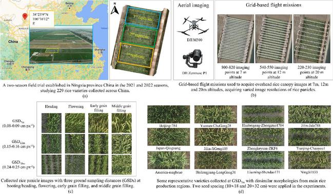 水稻(Oryza sativa)是许多国家必不可少的稳定粮食,因此在全球气候变化下提高其产量具有重要意义。要评价不同水稻品种的产量表现,单位面积穗数(Panicle Number per Unit Area,PNpM2)等与产量相关的关键性状是重要指标,已引起许多植物研究团体的高度重视。然而,由于复杂的田间条件、水稻栽培品种及其穗部形态特征的差异巨大,对稻穗进行大规模筛选以量化PNpM2性状仍然具有挑战性。