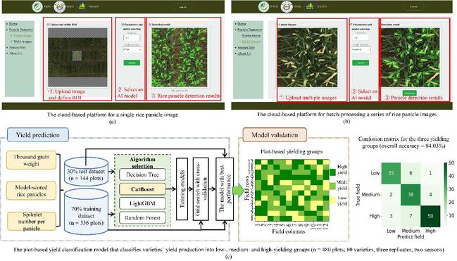 本文介绍一个开放的人工智能(AI)云计算平台--Panicle-Cloud,该平台能够从无人机采集的图像中量化稻穗。为促进人工智能检测模型的开发,课题组首先建立了一个由水稻专家注释的开放式多样化稻穗检测(Diverse Rice Panicle Detection, DRPD)数据集,随后将几个最先进的深度学习模型(包括本文提出的Panicle-AI模型)集成到 Panicle-Cloud平台。课题组将该平台应用于双季稻育种试验,以验证其生物学相关性,并利用该平台从数百个水稻品种中得出的PNpM2性状对产量进行分类。通过计算分析与人工评分之间的相关性分析,发现该平台能够可靠地量化PNpM2性状,并在此基础上对产量进行高精度分类。因此,该工作证明了在水稻PNpM2性状表型方面取得的宝贵进展,可为水稻育种人员在田间条件下筛选和选育理想的水稻品种提供有力的技术支撑。