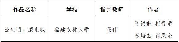 近日,教育部公布第八届高校廉洁教育系列活动入选结果,福建省高校共入选15项优秀作品,我校资源与环境学院选送的廉洁视频《公生明,廉生威》入选“润心话语”优秀视频作品(全省共4项)。