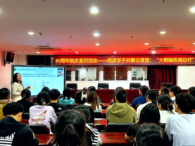近日,动物科学学院(蜂学学院)通过线上线下相结合方式开展举办两岸学子共聚大熊猫疾病诊疗专题“云”课堂活动。线下活动地点分别设在我校动物科学学院(蜂学学院)和台湾大学兽医专业学院会议室。学院党委副书记(主持)修新田、台湾大学兽医专业学院周崇熙教授、海峡(福州)大熊猫研究中心高级兽医师修云芳博士、福州熊猫中心科研团队骨干、动物科学学院(蜂学学院)动物医学专业学生代表、台湾大学兽医专业学院师生代表100余人参加活动。