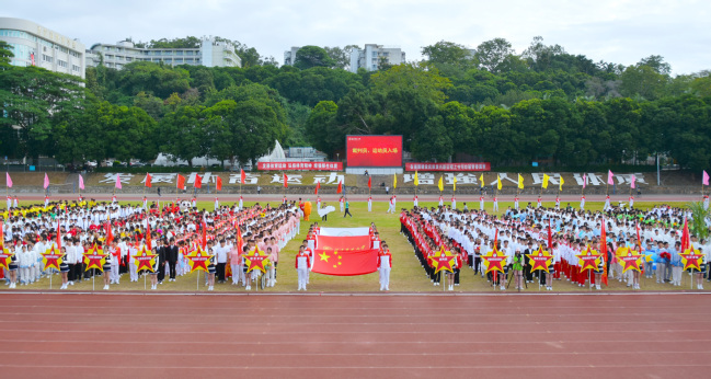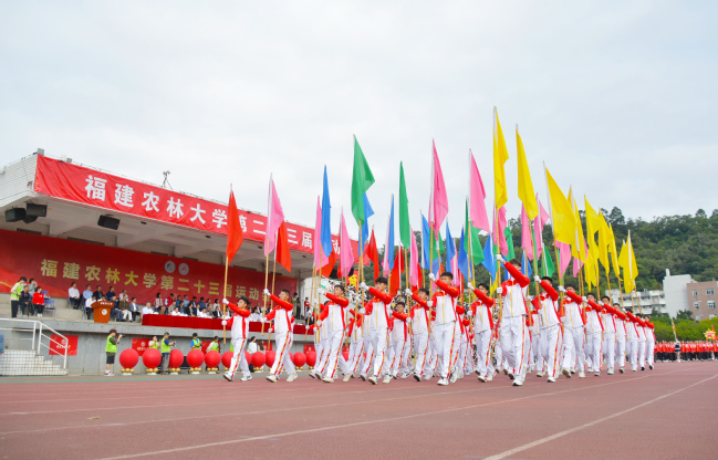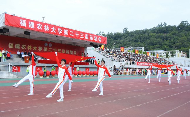 8时30分整,4名国旗护卫队同学迈着坚定的步伐护卫着中华人民共和国国旗走进现场。全场起立,高唱中华人民共和国国歌。五星红旗冉冉升起,迎风飘扬。随后校旗、会旗、彩旗方阵先后入场,裁判员方阵、各学院体育代表团方阵、教工运动员方阵等依次亮相。各方阵各具创意,他们矫捷的步伐、整洁的着装、嘹亮的口号、精心的编排,展现了师生昂扬向上、拼搏进取的精神风貌,赢得全场热烈掌声。