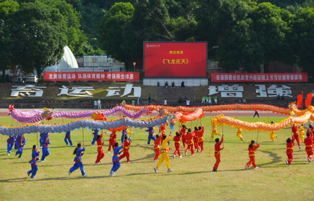 开幕式上还进行了鼓乐表演《蓄势》、舞龙表演《飞龙在天》、街舞表演《燃》、武术表演《中华魂》、啦啦操体育舞蹈表演《花漾青春》等,充分展现了传统文化与体育精神的融合之美,展示了我校浓郁的体育文化氛围。精彩纷呈的表演,深深打动了现场观众。