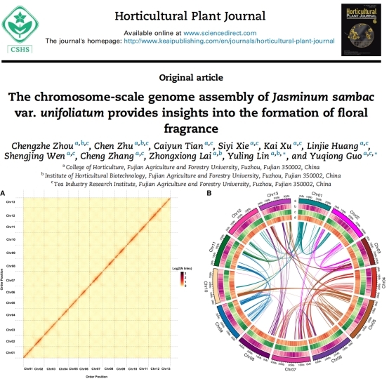 研究成果以“The chromosome-scale genome assembly of Jasminum sambac var. unifoliatum provides insights into the formation of floral fragrance”(单瓣茉莉花染色体级基因组组装为花香的形成提供新的见解)为题发表于国际知名期刊《Horticultural Plant Journal》(《园艺植物杂志》,文章链接:https://www.sciencedirect.com/science/article/pii/S2468014123000328)。