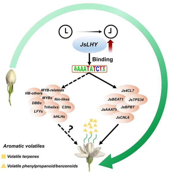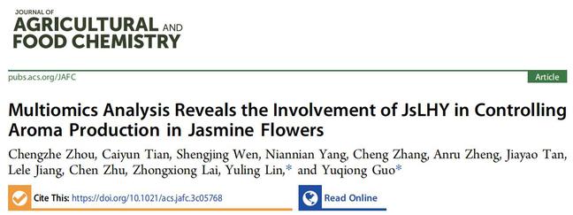 茉莉花(Jasminum sambac)是木犀科素馨属的一种直立或攀援型灌木,因花香馥郁优雅而闻名。福州是唯一以茉莉花为市花的省会城市,也是茉莉花茶的源产地。茉莉花释放的香气物质是茉莉花茶品质形成的重要物质基础,解析茉莉花发育过程中香气合成的调控机制,有助于高质高效利用茉莉花的香气,提升花茶品质。近期,我校数字经济学院(安溪茶学院)郭玉琼教授和园艺学院林玉玲教授团队在国际权威期刊《Journal of Agricultural and Food Chemistry》(《农业与食品化学杂志》)发表了题为“Multiomics Analysis Reveals the Involvement of JsLHY in Controlling Aroma Production in Jasmine Flowers”(多组学分析揭示JsLHY参与调控茉莉花香气的合成)的研究论文。