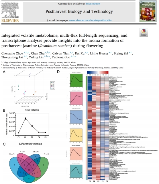 研究成果以“Integrated volatile metabolome, multi-flux full-length sequencing, and transcriptome analyses provide insights into the aroma formation of postharvest jasmine (Jasminum sambac) during flowering”(综合挥发物代谢组、多通量全长转录组和二代转录组解析采后茉莉花在开花过程中的香气形成机制)为题发表于国际权威期刊《Postharvest Biotechnology Journal》(《采后生物学与技术》,文章链接:https://doi.org/10.1016/j.postharvbio.2021.111726)。