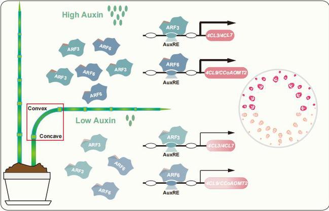 图1、 竹子发生机械弯曲时,生长素响应因子调节木质素生物合成的机制