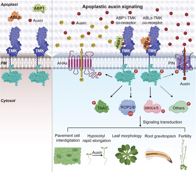 胞外的生长素快速诱导质外体定位的生长素结合蛋白ABP1/ABLs与类受体跨膜激酶TMKs胞外结构域形成生长素受体复合体,将胞外生长素信号传递到细胞内,激活后的TMKs通过磷酸化方式调控一系列下游底物活性,最终调控植物细胞形态建成,下胚轴快速伸长,叶片发育,根向重力性和育性等生长发育过程。