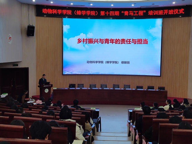 11月20日,动物科学学院(蜂学学院)第十四期“青马工程”培训班开班仪式暨团课第一讲在博学报告厅举行。学院党委副书记(主持工作)修新田、院党委副书记贺鹏、青马班学员260余人参加活动。学院团委书记吴元华主持活动。