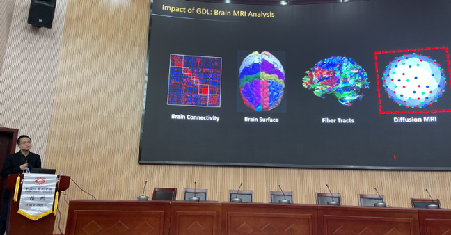 陈耿教授首先介绍了弥散磁共振影像作为磁共振成像的一种衍生技术,在脑科学研究和脑疾病诊断中有着举足轻重的作用,随后探讨了如何对高维弥散磁共振数据做几何表征,进而基于几何深度学习实现智能弥散磁共振影像计算。