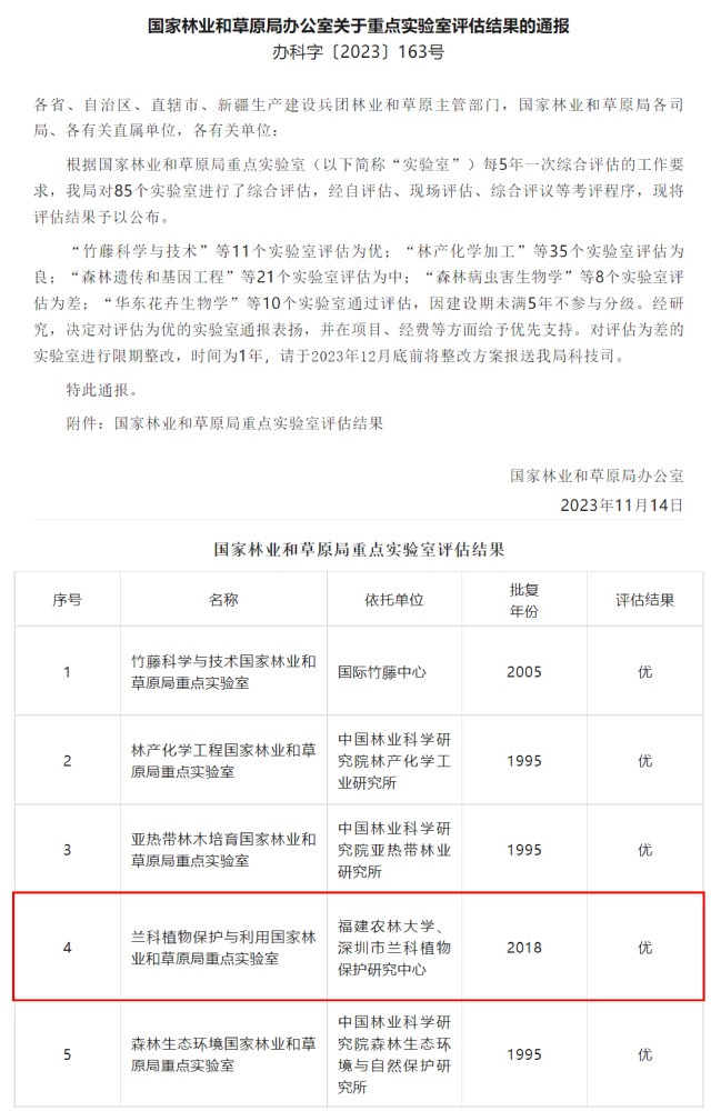 11月14日,国家林业和草原局发布下属85个重点实验室评估结果,11个实验室评估为“优”。其中开云网页版“兰科植物保护与利用国家林业和草原局重点实验室”获评为“优”。评估结果是对重点实验室工作的充分肯定,对于推动兰科植物的保护和产业的发展具有重大的意义。