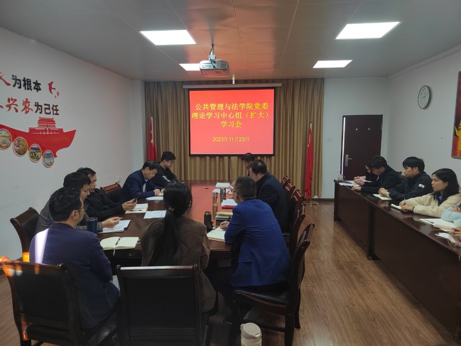 11月23日上午,公共管理与法学院党委召开理论学习中心组学习(扩大)会,会议由学院党委书记曾起郁主持,学院党委理论学习中心组成员、全体党支部书记参加会议。