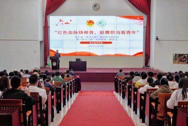 11月16日,数字经济学院于校区诚智报告厅召开红色血脉铸根骨,挺膺担当看青年”第十届“青马工程”培训班开班仪式暨“青马工程”培训班第一期学习会。院党委副书记(主持工作)黄成茂、院党委副书记张云帆、院团委书记黄国栋、全体辅导员以及培训班全体学生共200余人参加了此次活动。开班仪式由黄国栋主持。