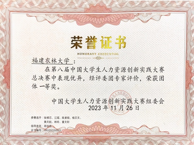 11月24-26日,由河北雄安新区管理委员会、中国劳动关系学院、国投人力资源服务有限公司、中国雄安集团有限公司共同主办的第八届中国大学生人力资源创新实践大赛(HRU)总决赛在河北雄安新区举办。由我校公共管理与法学院学子组成的代表队(学生:张柳芯、江瑶、陈姜锐、杨艾文、黄天航、林玲、董文轩,指导教师:周毕芬)获得团体一等奖的佳绩。本次大赛共有300余所高校参与,经过全国六大地区赛比拼,来自各地共计61所高校600余位选手挺进总决赛。总决赛设团体特等奖6项、一等奖20项、二等奖35项。