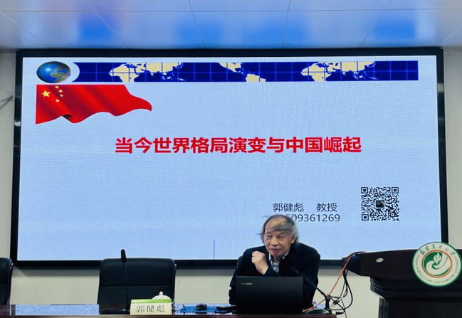 郭健彪教授围绕“当前国际形势基本态势”和“百年变局与中华民族伟大复兴”两部分内容展开讲解。郭健彪指出,当今国际形势围绕安全与发展两大主线深入展开,世界格局发生重大转变,和平与发展的时代主题仍然面临严峻挑战。我们要高度警惕两个可能的陷阱:一是中美地缘战略竞争的“修昔底德陷阱”;二是中国同西方意识形态对抗的“冷战陷阱”。随后,他从中美关系、俄美关系、中俄关系、美欧关系、中欧关系、俄与美西方关系等角度阐述了当前国际的基本态势,并且指出中国共产党所致力的是服务于人民幸福、民族复兴、世界大同,实现中华民族伟大复兴与推动构建人类命运共同体,追求的是发展,崇尚的是共赢,传递的是希望。