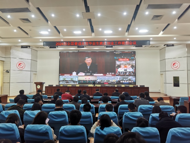 12月5日,教育部、人力资源社会保障部召开2024届全国普通高校毕业生就业创业工作视频会议,教育部党组书记、部长怀进鹏,人力资源社会保障部党组成员、副部长吴秀章,工业和信息化部党组成员、副部长王江平出席会议并讲话,教育部党组成员、副部长翁铁慧主持会议。我校在禧强楼学术报告厅设分会场,校长兰思仁、校党委副书记曾华平,校学工部相关负责人、各学院党委副书记、全体毕业班辅导员等100余人参加会议。