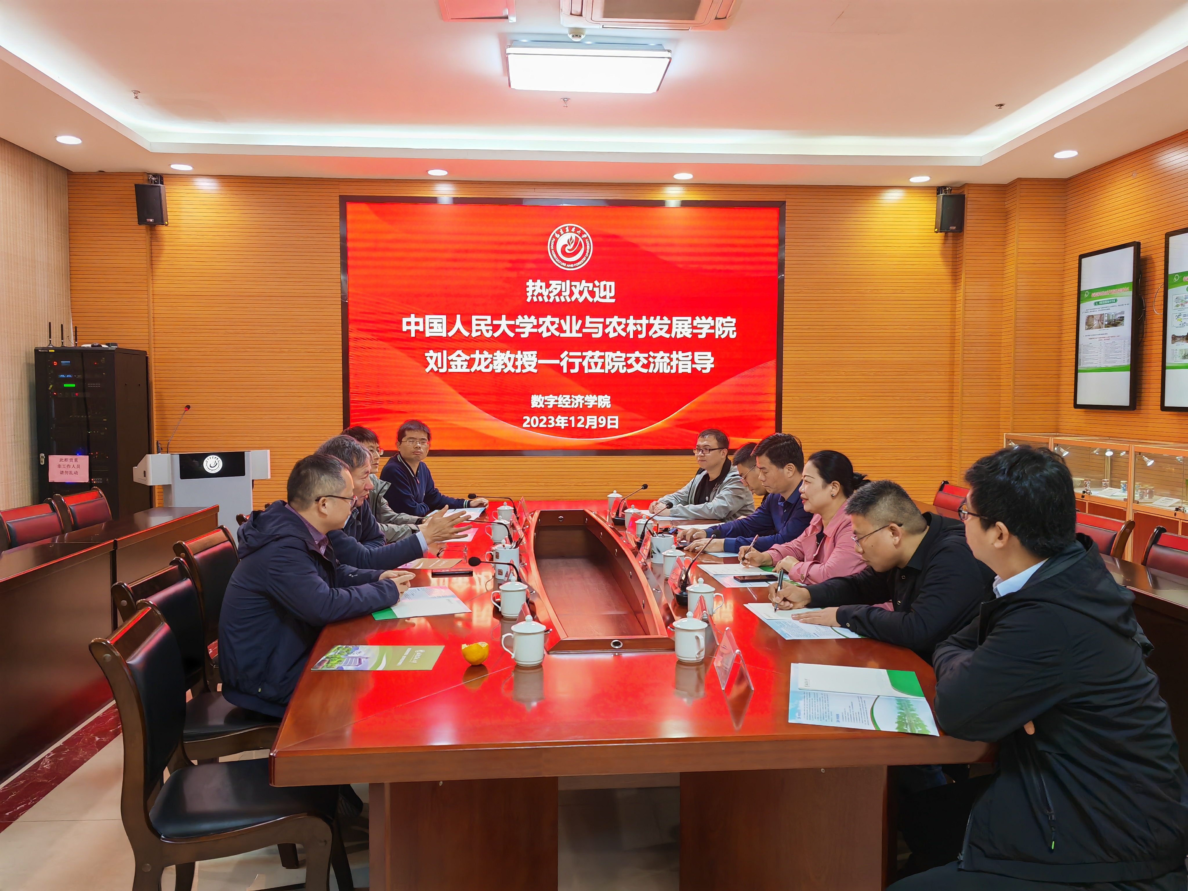郭玉琼代表学院对刘金龙教授一行来访表示热烈欢迎,感谢中国人民大学农业与农村发展学院长期以来对学院的关心和支持,简要介绍了数字经济学院组建宗旨、专业设置、学科建设和产教融合情况。她表示,学院积极探索“校地企合作”的办学模式,通过产教融合,致力于开展科学化的社会服务,已在科学研究、人才培养、生态规划、技术推广、产业培育与转型提升等方面建立了常态化机制,得到了社会的认可。