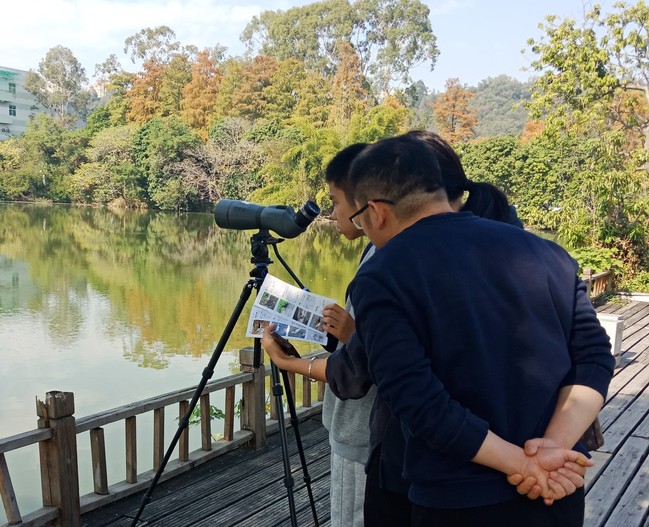 协会成员带领校内师生、校友通过望远镜、鸟类图册观察了解生活在湿地公园的各种鸟类,并进行科普讲解。活动期间观察到白鹭、夜鹭、黑水鸡、小鸊鷉等各具特色的鸟类。
