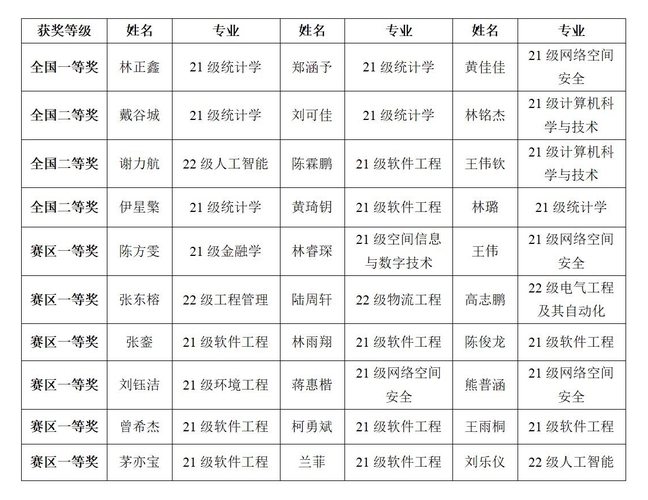 近日,由教育部高教司、中国工业与应用数学学会主办的2023年全国大学生数学建模竞赛获奖名单揭晓。我校再创佳绩,63支参赛队伍中有30支队伍获奖,其中1支队伍获得全国一等奖、3支队伍获得全国二等奖、6支队伍获得福建赛区一等奖(详见附表)。获全国奖的质量和数量均取得近年来最好的水平。