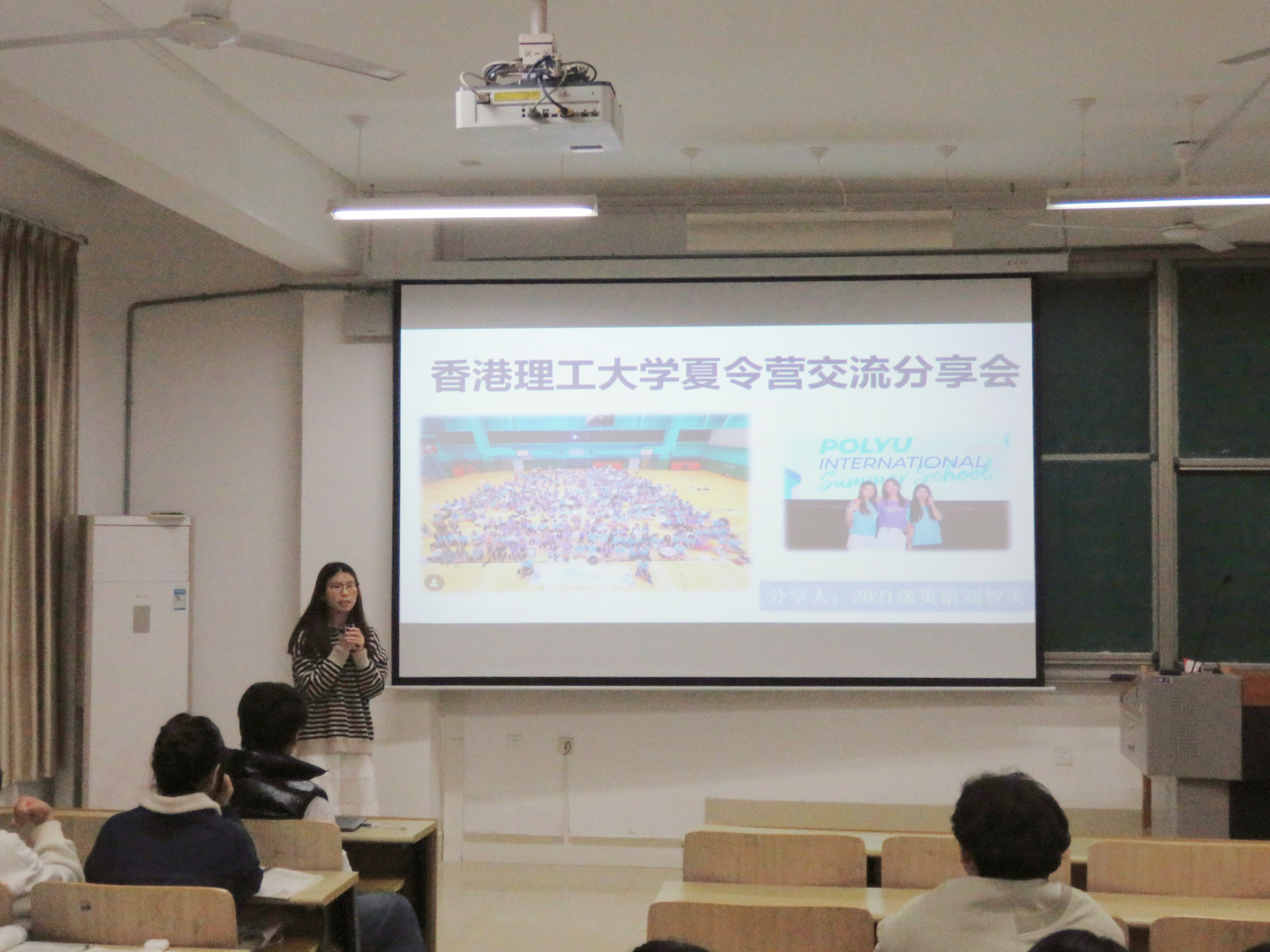 刘智美同学就其在香港理工大学夏令营为期一个月的交换生经历,分别就夏令营项目概述、申请流程、学习生活收获为同学们进行详细介绍,并在最后给予同学们“去体验,去思考,去决定,去成长”的寄语。