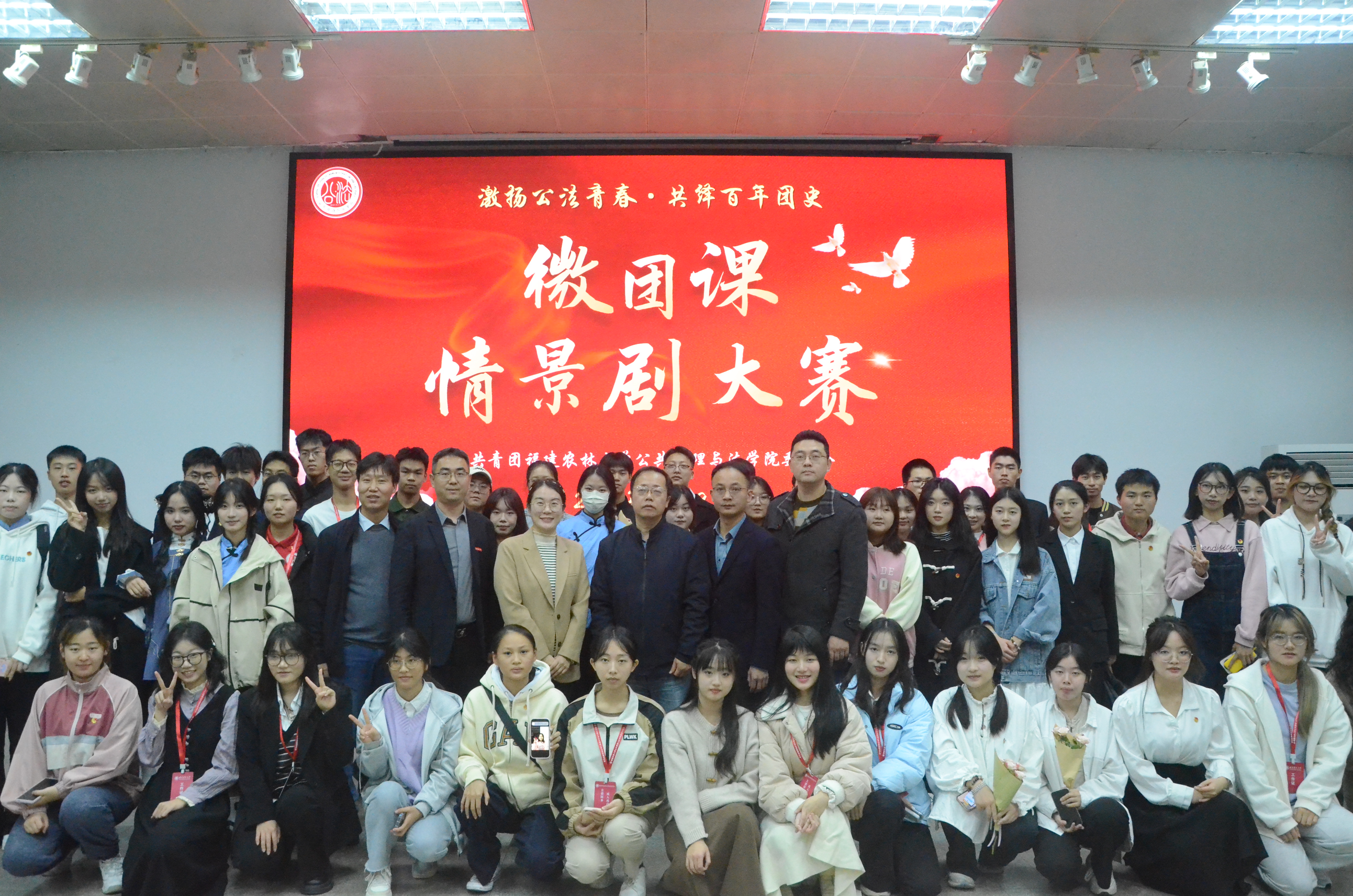 12月9日晚,公共管理与法学院在百悟讲坛举办第一届“激扬公法青春·共绎百年团史”微团课情景剧大赛。福州大学土木工程学院团委书记江小敏、开云网页版团委谢国富、园艺学院团委书记马端山、林学院团委书记鲍春、公共管理与法学院团委书记王荣华应邀担任比赛评委嘉宾,学院党委副书记郑龙章、辅导员杨小倩、沈芳儒、张淑灵、姜燕蓝与各团支部同学共计130余人到场观看比赛。