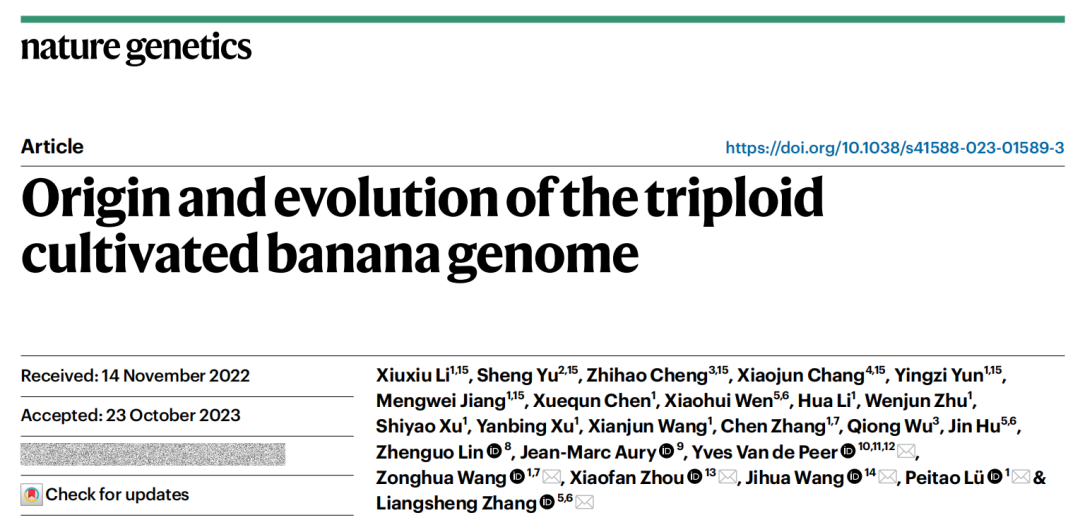 2023年12月11日,开云网页版植物保护学院李秀秀、云英子副教授在国际著名期刊《Nature Genetics》(自然—遗传学)上在线发表了题为“Origin and evolution of the triploid cultivated banana genome”(三倍体栽培香蕉基因组起源与进化)的研究论文。