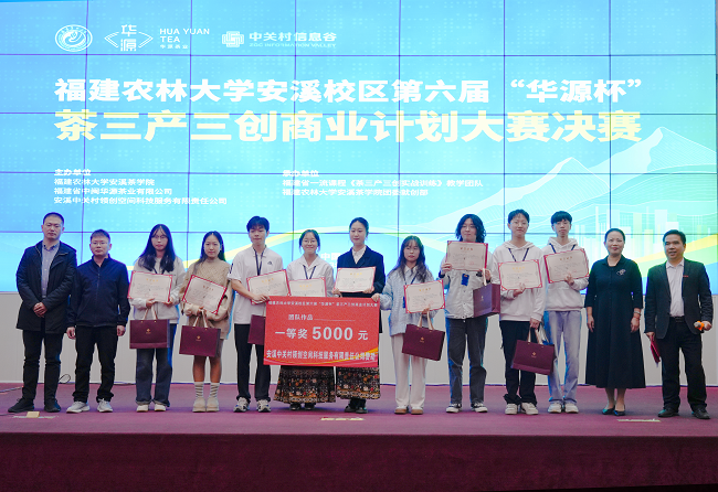 为发挥产教融合办学优势和特色,课赛结合、以赛促学,安溪校区、福建省中闽华源茶业有限公司、安溪中关村领创空间科技服务有限公司共同主办,福建省一流课程《茶三产三创实战训练》教学团队、安溪茶学院团委就创部承办的安溪校区第六届“华源杯”茶三产三创商业计划大赛决赛于2023年12月7日在安溪校区举办。校区主任黄成茂、郭玉琼、副主任张云帆、吴义炳和联办方代表福建省中闽华源茶业有限公司许灿灿经理、安溪中关村领创空间科技服务有限责任公司李遥恒经理、所有评委及校区300多名师生参加了颁奖仪式,决赛和颁奖仪式由茶业科技系党支部书记、主任高水练副教授主持。