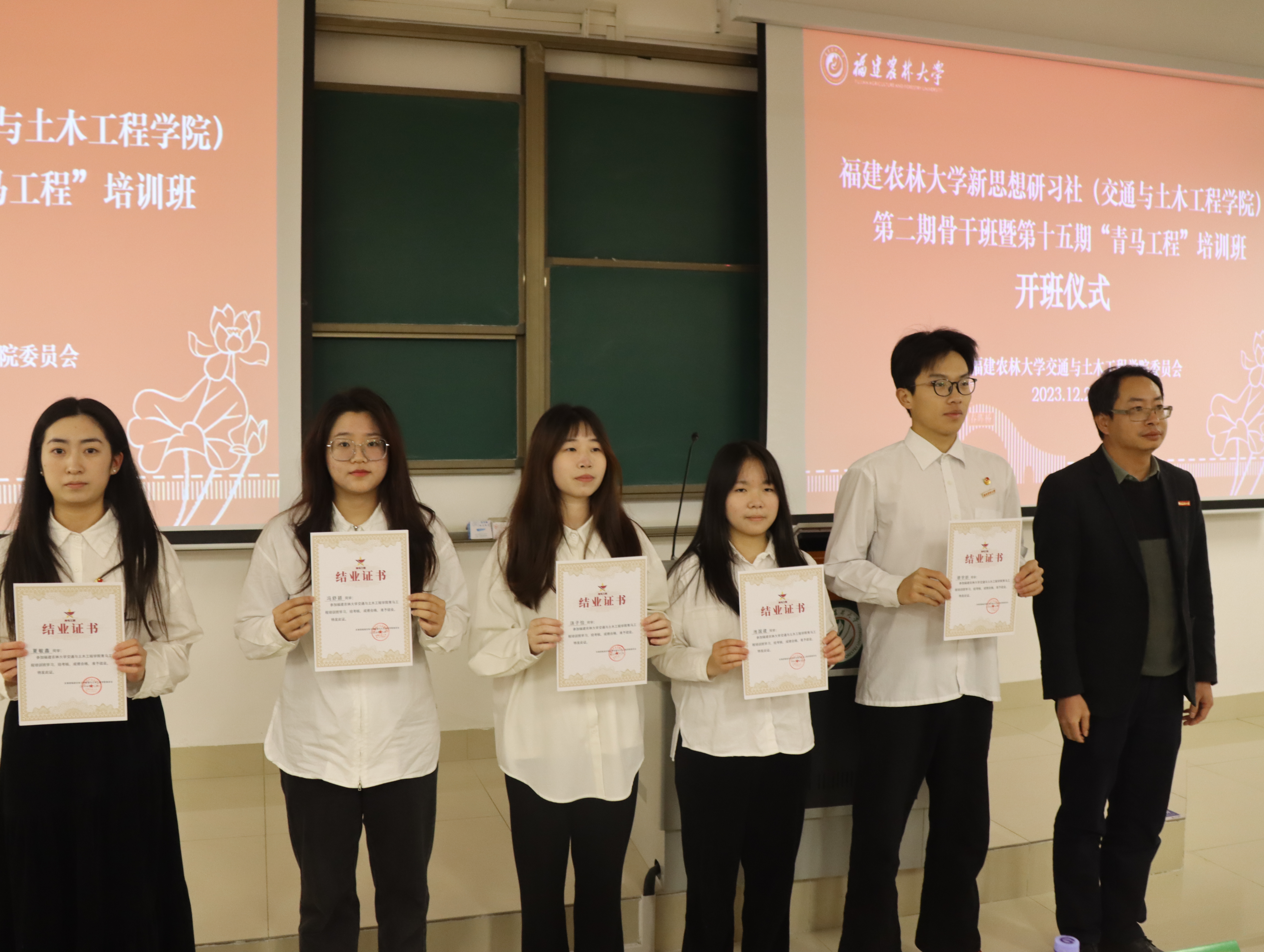 仪式上,院团委书记叶善斌介绍了学院第14期青马班培养情况,并由李治洲为第14期的青马班优秀学员代表颁发结业证书。