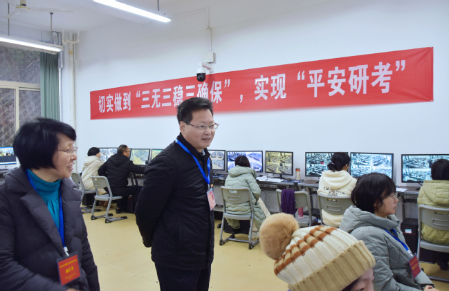 党政办、考试中心、武装部(保卫处)、教务处、研究生院、现代教育技术与信息管理中心等部门负责人陪同检查。