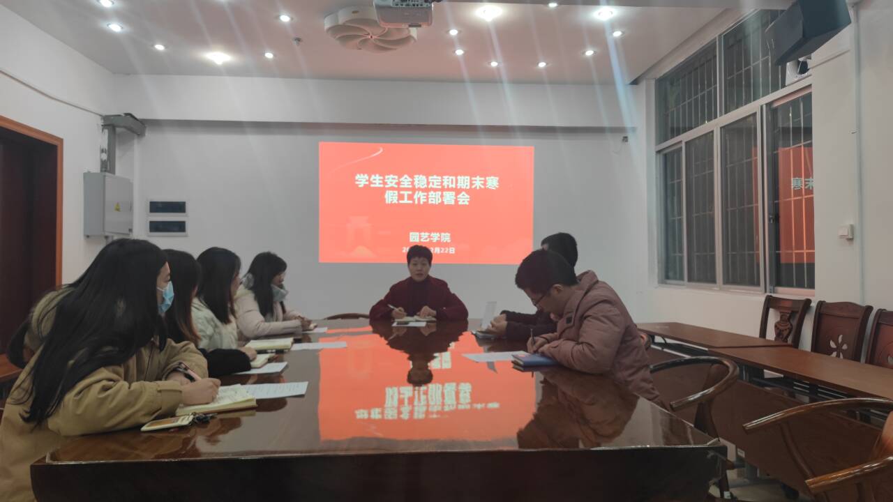 12月22日下午,园艺学院于学院一楼会议室组织召开学生安全稳定和期末寒假工作部署会。学院党委副书记康恩慧、全体辅导员参会,会议由康恩慧主持。