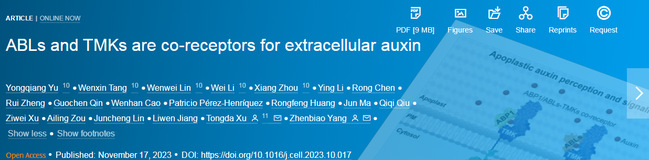 11月17日,徐通达团队与杨贞标团队合作在国际期刊Cell(《细胞》)杂志发表题为“ABLs and TMKs are co-receptors for extracellular auxin” (“生长素结合蛋白ABLs和TMKs激酶形成共受体感受胞外生长素”)的研究论文,这是继徐通达团队2019年、杨贞标团队2021年分别在 Nature上解析生长素-TMK信号途径后的又一重大进展。