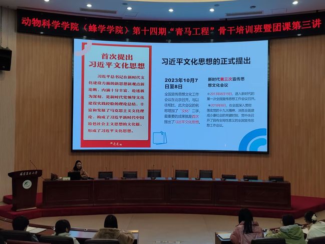 近日,校团委组织“团员和青年主题教育导师团”走进动物科学学院(蜂学学院)“青马工程”大学生骨干培训班举办专题团课。导师团成员马克思主义学院青年教师王欢受邀作《习近平文化思想》主题报告。学院辅导员、团学骨干、研习社成员、各班级团支书和班长共200余名师生参加学习。